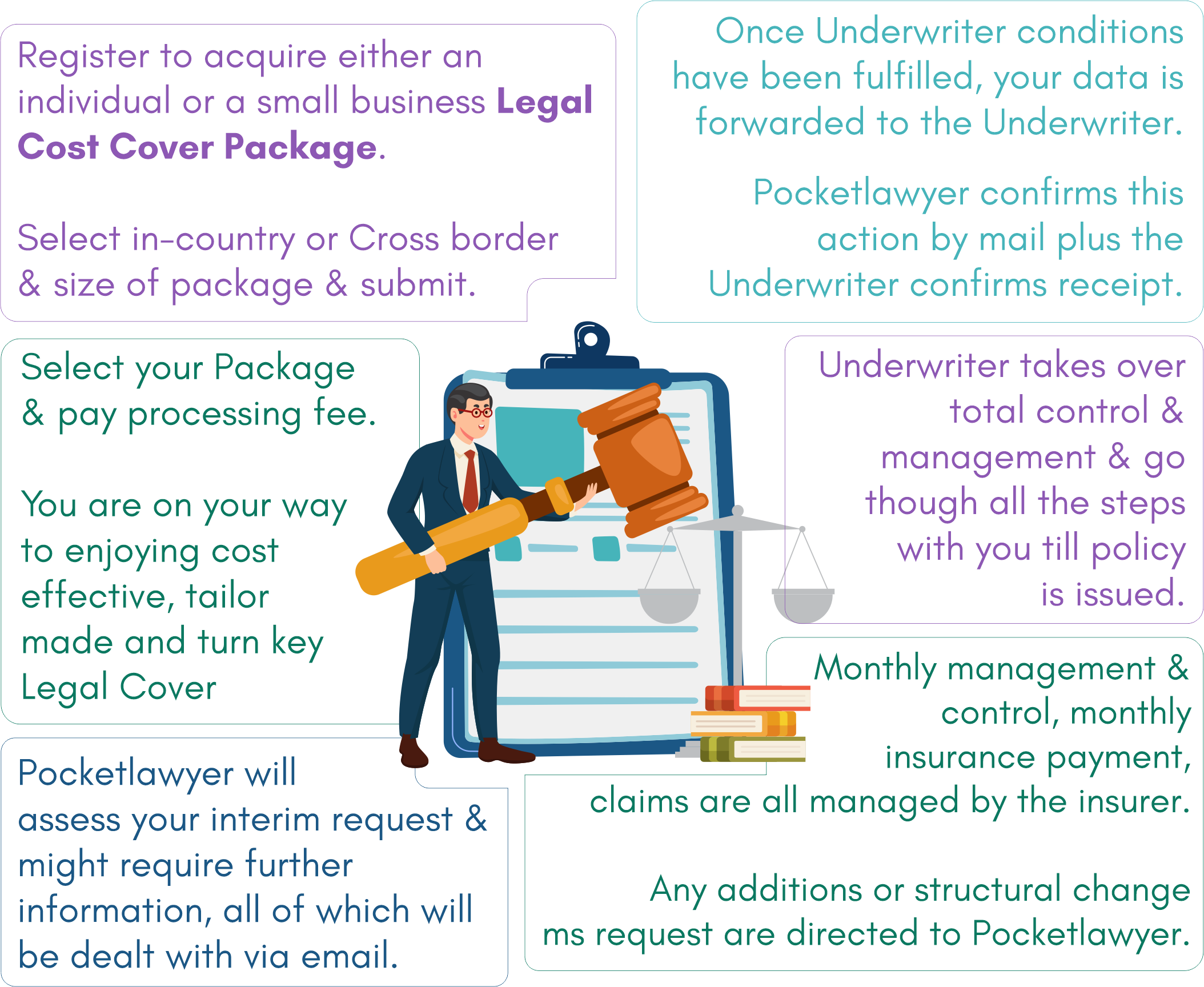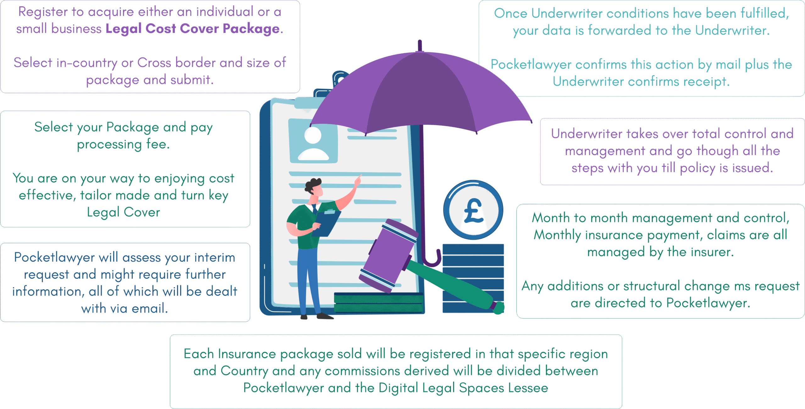 Pocketlawyer, as a Global Marketplace, will obtain the initial data required by the Underwriter and charge a processing fee for its services. The client data file will then be handed over to the respective Underwriter, who will manage the entire process going forward.